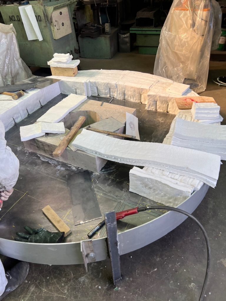 製作を行った炉蓋にセラミックブランケットを隙間なく入れていきます。