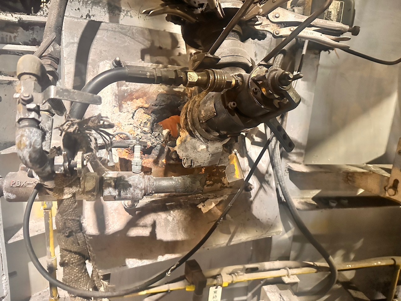 内部の耐火材等を解体し前板周辺の設備機器を外して古いバーナー前板全体を外していきます。