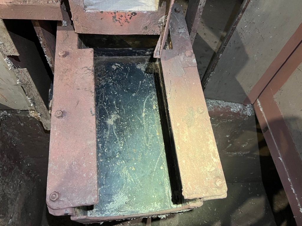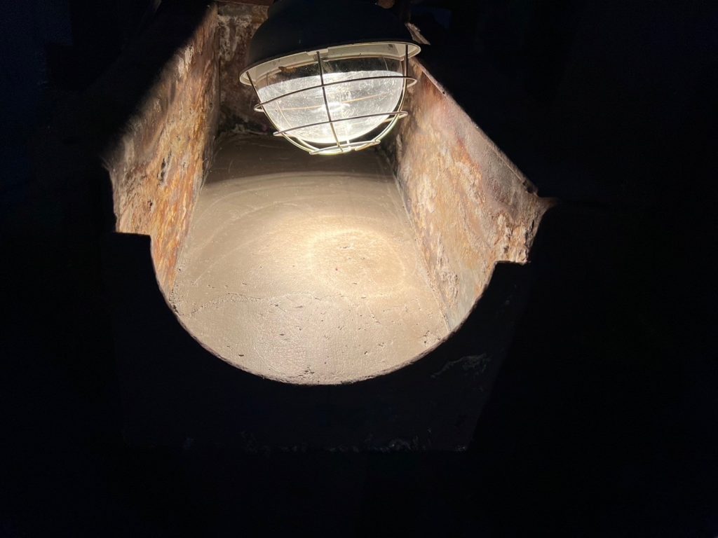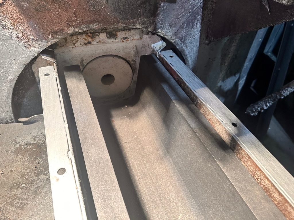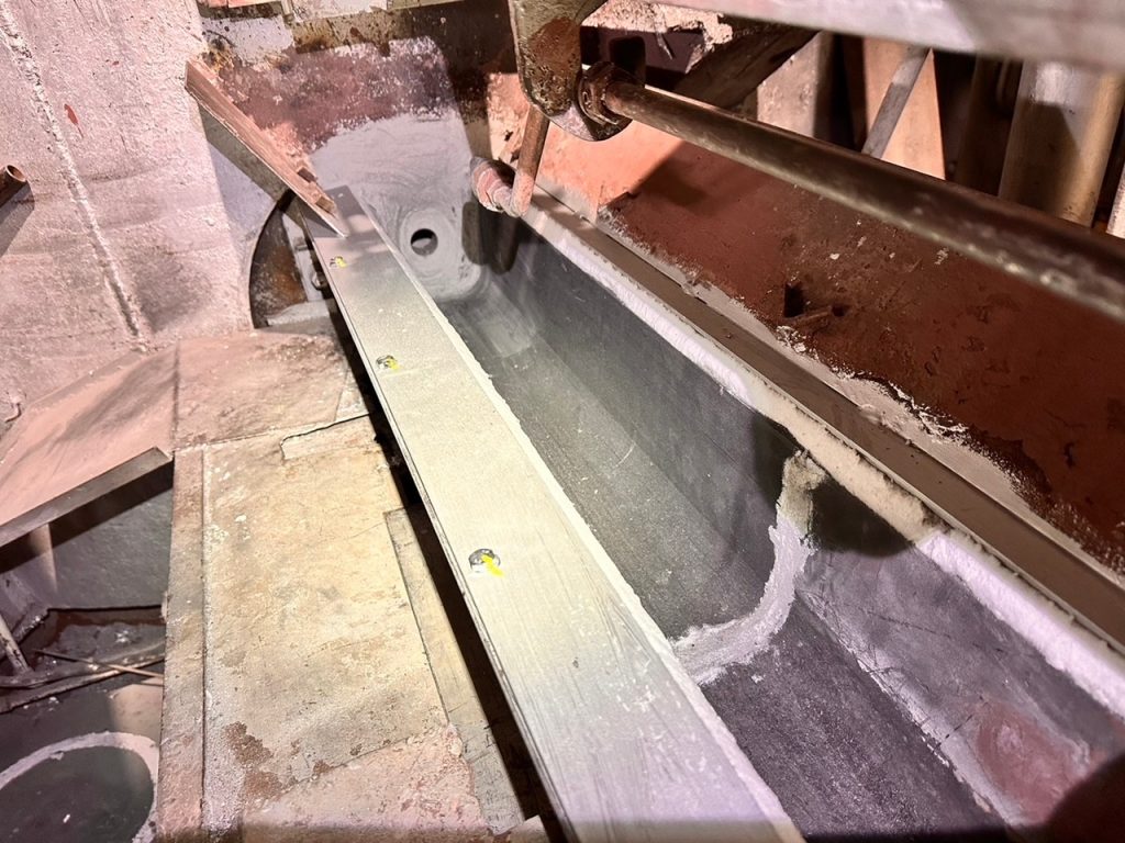 耐火材を施工し上部からボルトで金具を締め込みカーボン樋が動かない様に固定をして施工が完了です